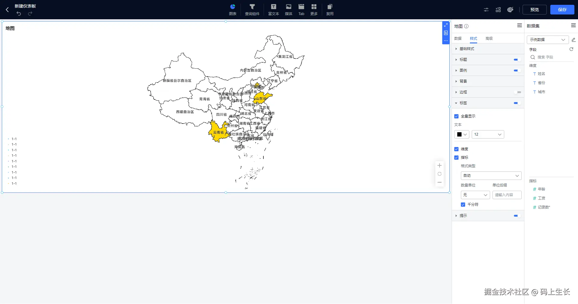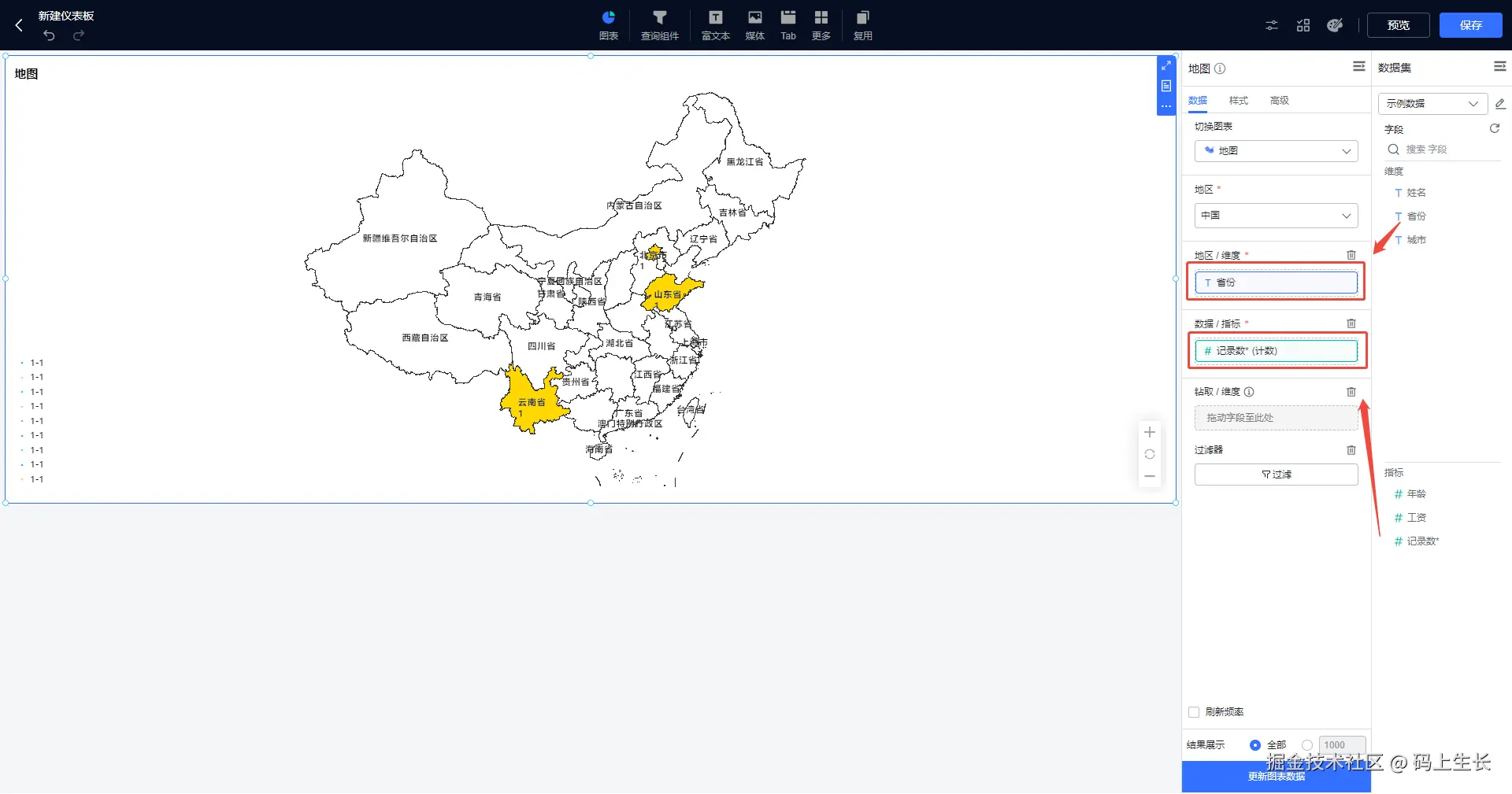 首先创建了一个仪表板来展示用户的地区分布情况。通过拖动地图组件到仪表板中,并选择省份作为维度,记录数作为指标,即可直观地展示每个省份的用户数量。在地图的标签设置中,可以根据需求选择是否显示省份名称、统计字数等信息,以便更好地呈现数据。