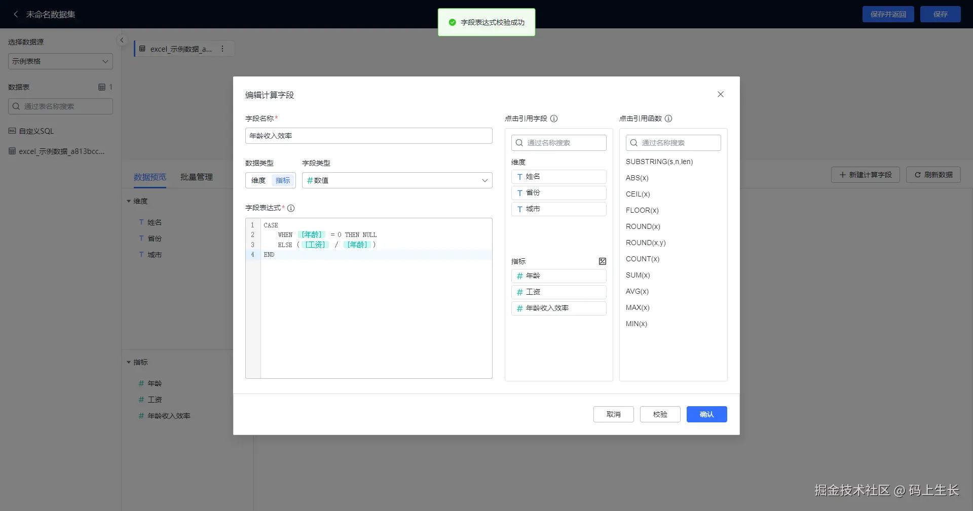 此外,DataEase 还支持新建计算字段,用于对表格中的数据进行进一步处理。例如,在示例数据中,如果需要计算一个名为“年龄收入效率”的指标,其公式为:年龄收入效率 = 工资 / 年龄。可以在字段表达式中写入以下 SQL 表达式,并进行校验: