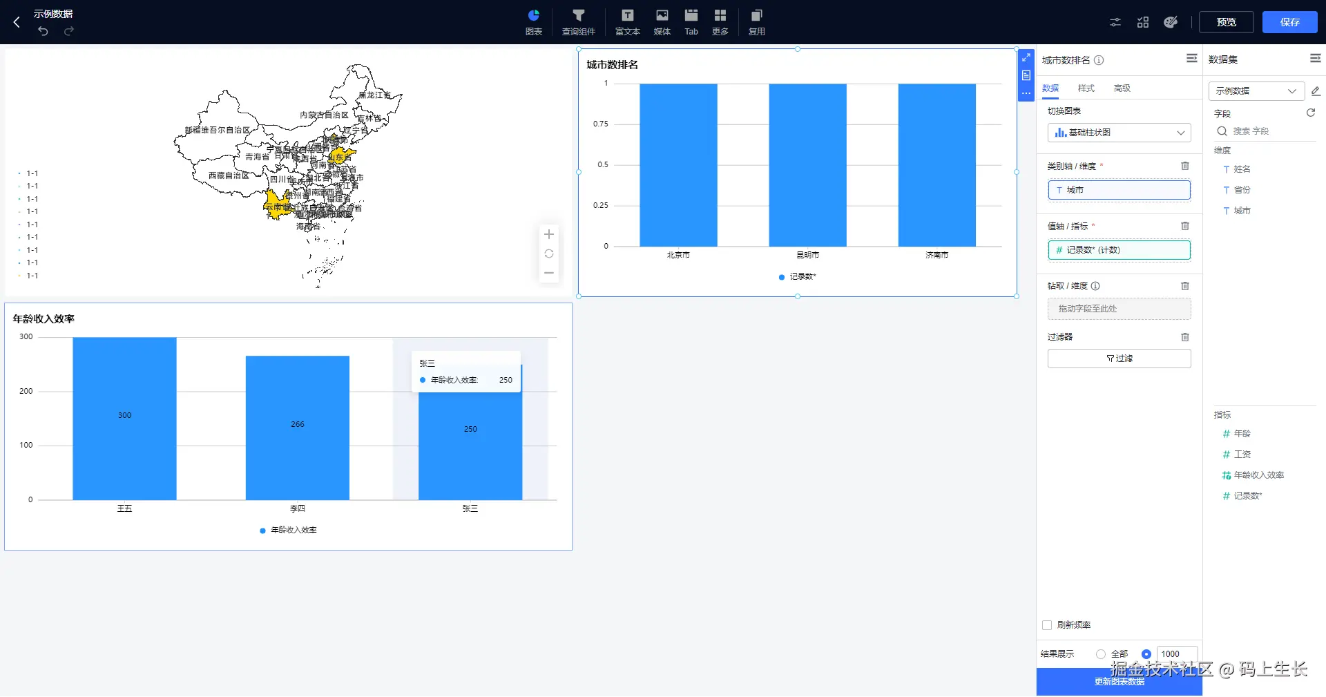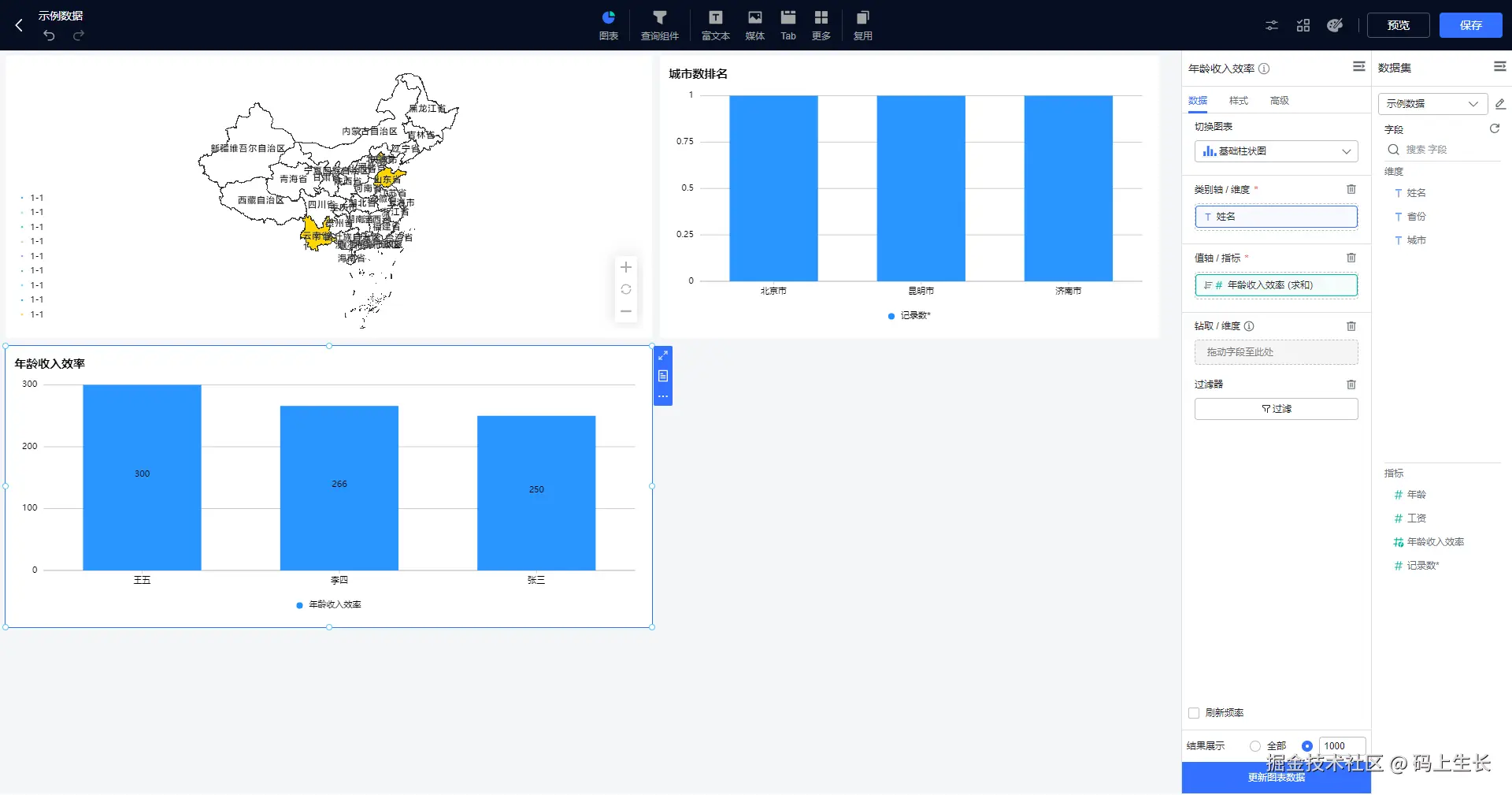 最后,利用仪表板展示“年龄收入效率”的分析结果。在维度处选择姓名,指标处选择“年龄收入效率”,并设置排序,即可生成相应的图表。通过该图表,可以直观地比较不同用户的年龄收入效率。