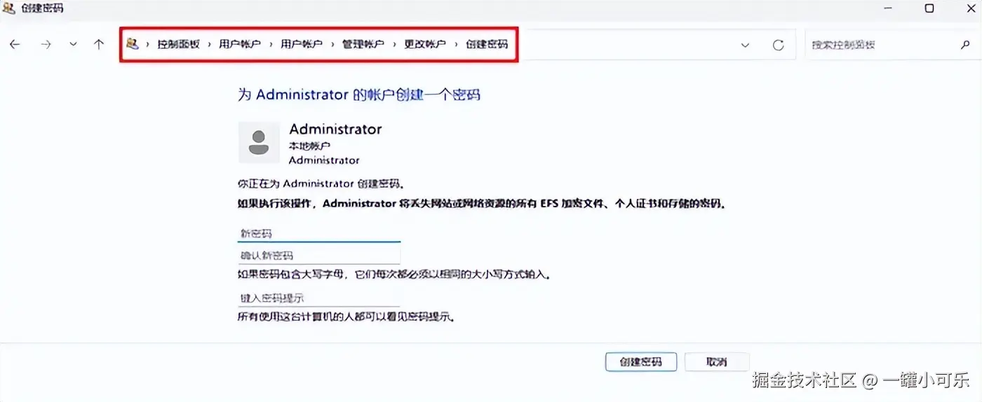 具体的操作步骤是在搜索框中搜索控制面板并进入,点击【用户账户】选项,选择【管理账户】-【更改账户】,在更改账户界面中,点击【创建密码】,然后根据界面提示设置密码即可。
