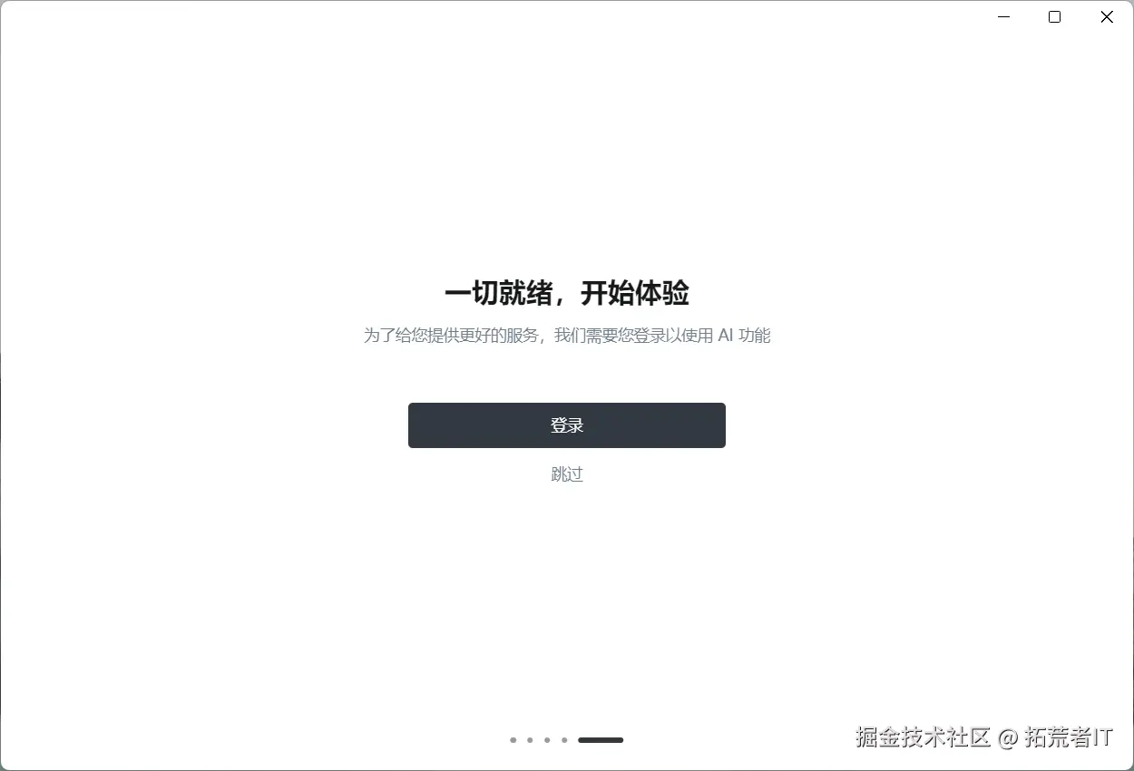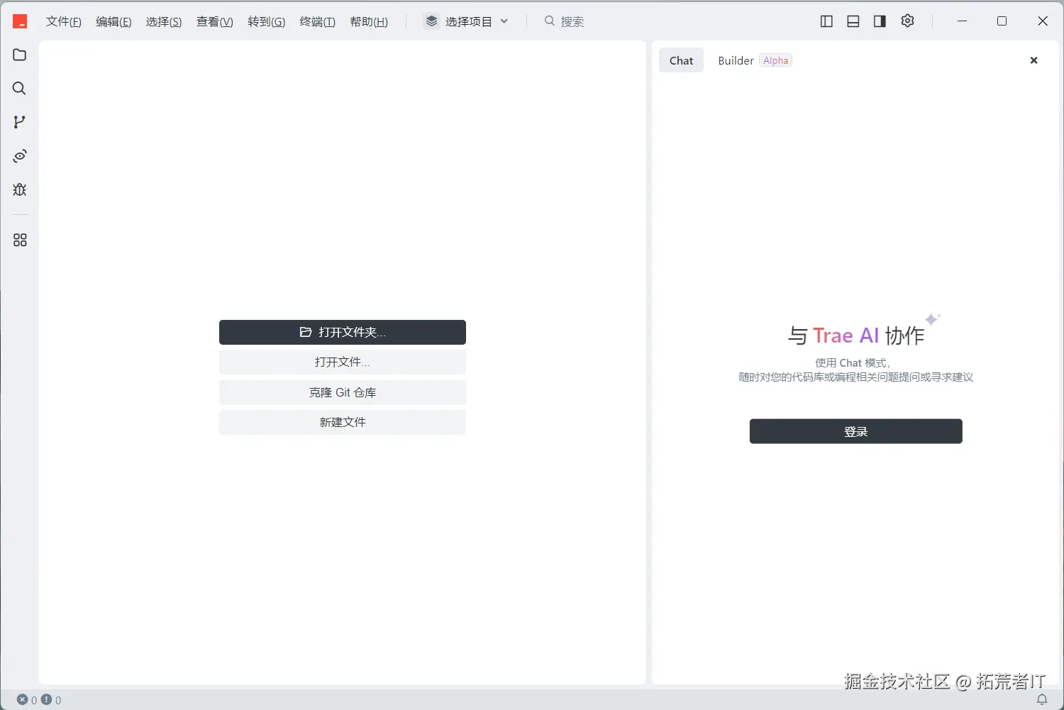 这里是配置的最后一步,刚开始我选择跳过,但是打开之后如果不登录,则无法使用AI功能,因此这里点击登录。此时会打开浏览器,在浏览器登录完成后会对trae授权。目前支持两种登录方式: