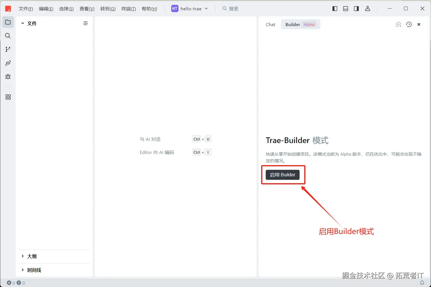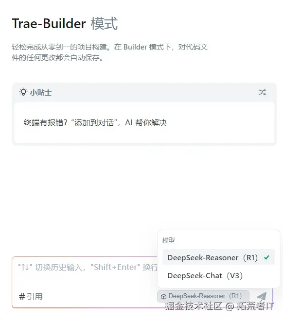当我们登录账号后,在AI面板会展示出来支持的两种模式,分别是Chat模式和Builder模式。