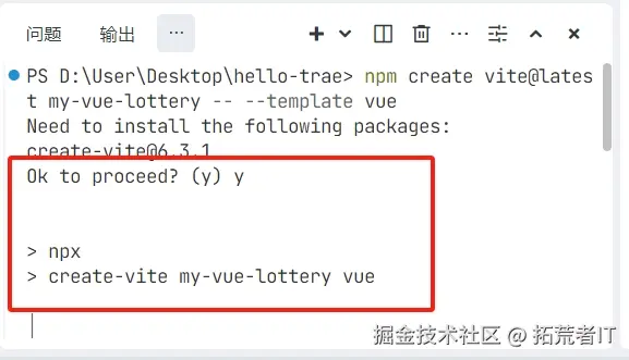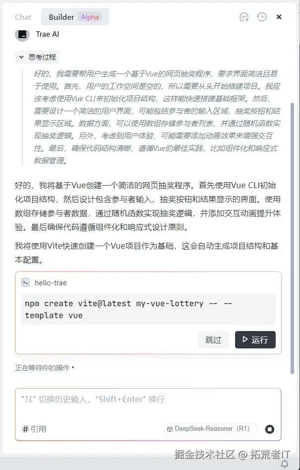 trae在执行命令的时候,会停下来让我们审阅和运行。我们点击运行,trae会帮我们运行创建项目的命令,接下来每一个步骤都会询问我们(个人感觉有点烦哦,可能是Alpha的原因),命令行里执行代码也需要选择和确认: