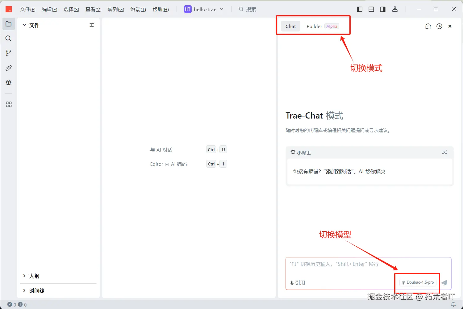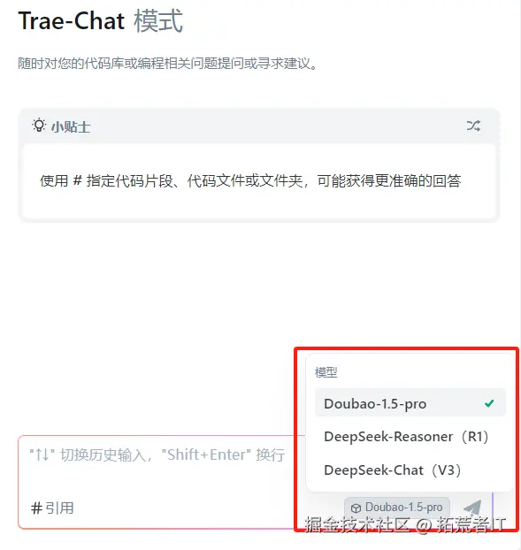 Trae Chat模式左侧面板展示一个对话框,用来输入我们想要AI帮助解决的问题。在窗口底部右侧可以选择使用的AI模型