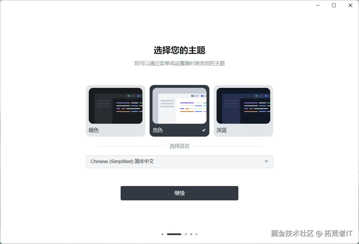 选择自己喜欢的主题,我这里选择的是亮色,黑色和深蓝配色也很棒,大家可以选一个自己舒适的颜色。选定后继续: