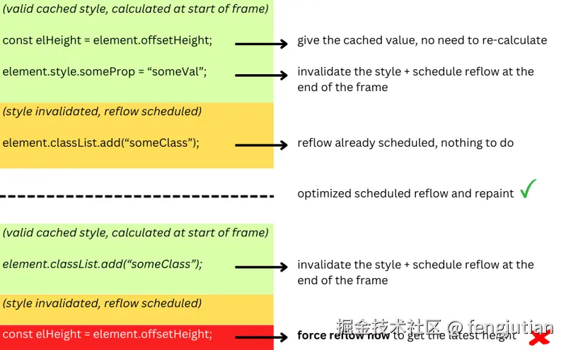 offsetHeight、clientHeight、getBoundingClientRect、getComputedStyle、event.offsetX等。有关“测量”操作的详细列表,如果这些操作在无效的布局上执行,将强制同步回流。 - ... 更多计算