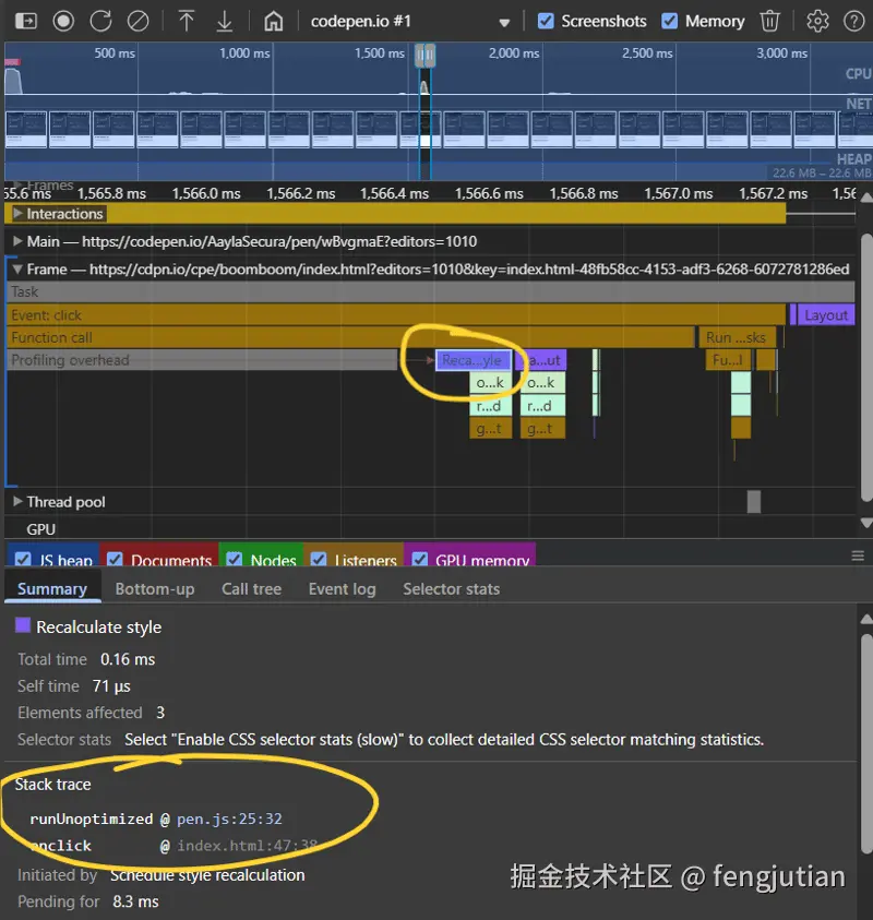 - 停止录制并检查时间线。强制回流将显示为顶部事件行下方的小紫色框。当你点击这些框时,它还会告诉你哪一行代码导致了这个问题: