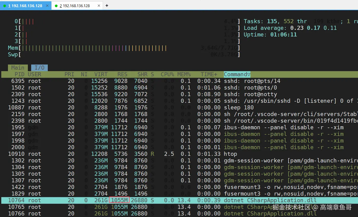 程序是跑起来了,那真的是吃了1G呢? 可以先用 htop 观察程序,从截图看没毛病。