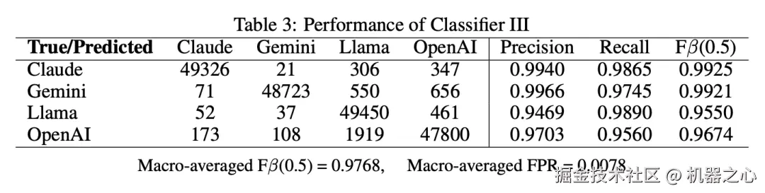 他们用 OpenAI、Llama、Claude 和 Gemini 这些 AI 模型生成的英文文本来训练这些分类器。为了保证训练的公平性,每个分类器都会收到相同数量来自不同 AI 模型的训练样本。