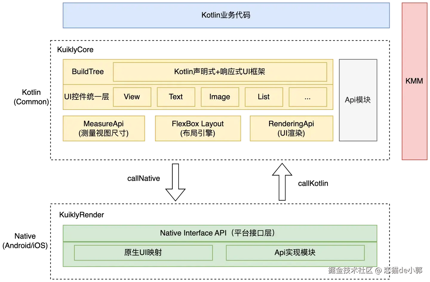 在查阅资料后才发现,2023 年的时候,「腾讯技术工程」团队就在知乎分享过 Kuikly 的实现,Kuikly(Kotlin UI Kit,发音同 quickly),项目就是使用 Kotlin 开发了自己的一套声明式 UI 框架,同时映射到系统原生控件做渲染,最终用 KMM(Kotlin Multiplatform Mobile)实现跨端。