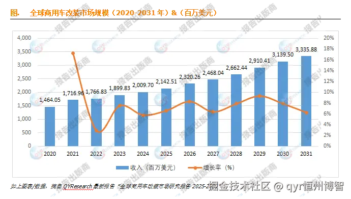 根据QYResearch发布的新市场研究报告《2025-2031 年全球商用车改装市场报告》,2024 年全球商用车改装市场价值估计为 20.10 亿美元,预计到 2031 年市场规模为 33.36 亿美元,2025-2031 年预测期内的年复合增长率为 7.66%。