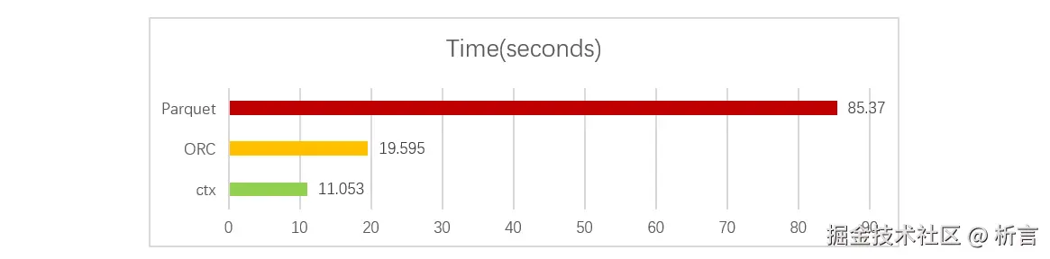 经过对比测试,ctx 读取性能几乎比 ORC 快了一倍,更是远远超过了 Parquet: