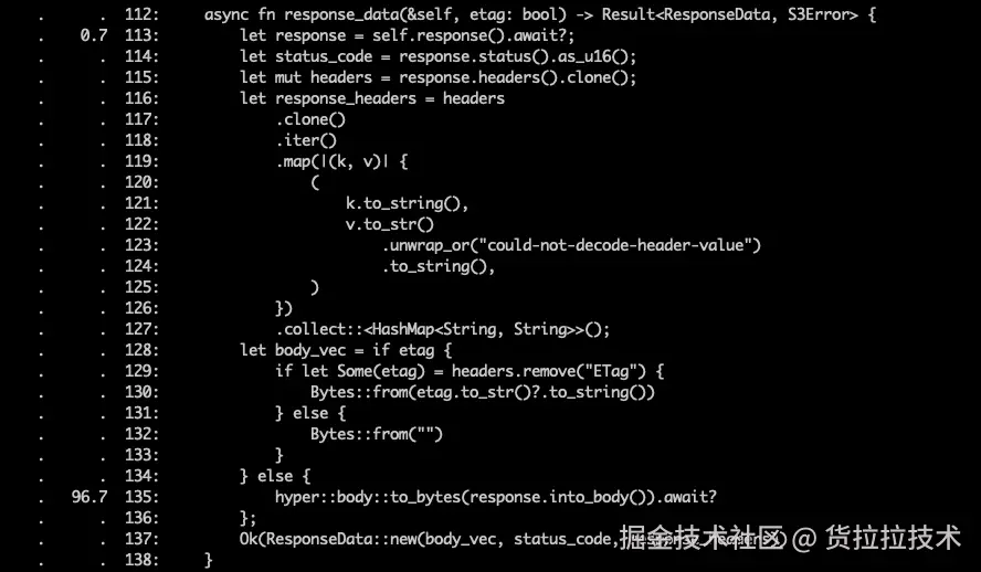 项目中用到 rust-s3 这个库的 get_object 方法。检索这个仓库的 issue 列表,没有发现有人提过内存泄漏问题。当我们进一步查看函数的调用栈时,发现分配的内存主要集中在 hyper::body::to_bytes 方法中