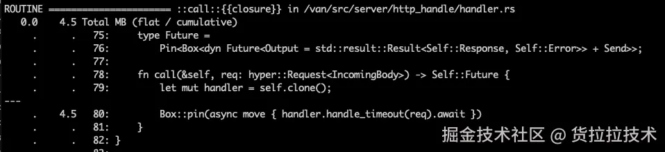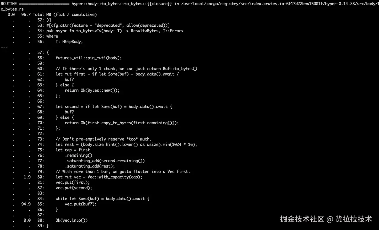 前文中提到内存主要集中在 hyper::body::to_bytes 方法中。通常情况下,一个函数执行完成了,执行过程中的申请的内存都会释放。如果出现像下面的情况,是所有权转移了,数据被缓存了,而非这个异步函数阻塞了。
