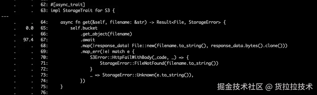 除了正则使用不当导致的内存增长外,我们还要观察到内存集中在 rust-s3 第三方库的调用中。