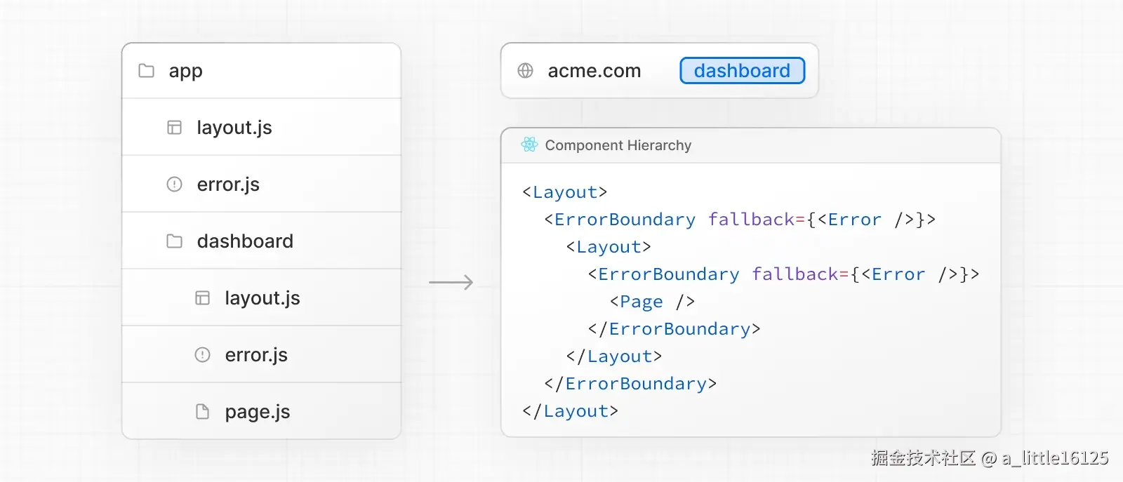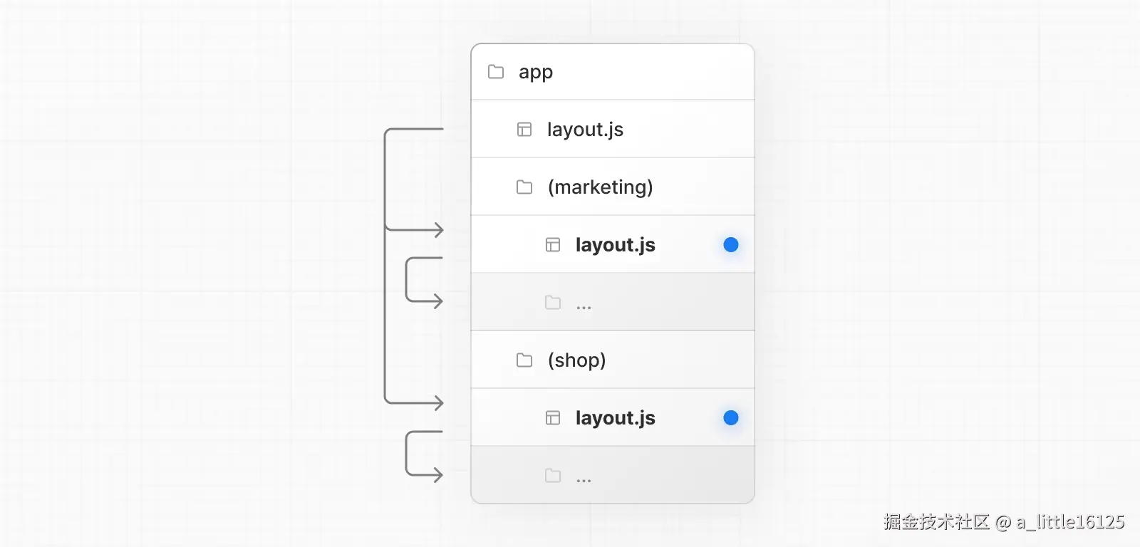 如果你要组合下面的两个布局,根布局 (app/layout.js) 将包装仪表板布局 (app/dashboard/layout.js),后者会将route 包装在 app/dashboard/* 内。