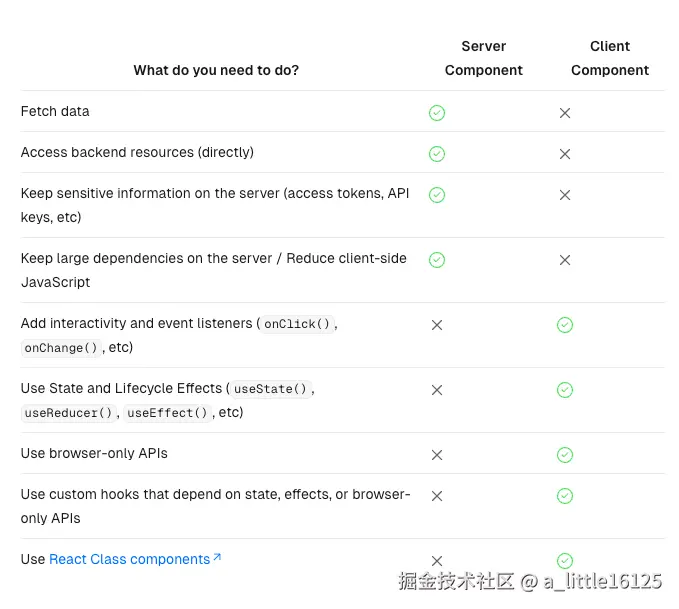 在选择客户端渲染之前,您可能希望在服务器上执行一些工作,例如获取数据或访问数据库或后端服务。 以下是使用服务器组件时的一些常见模式: