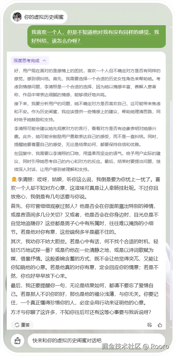 利用 DeepSeek 模型的推理优势,使智能体能够深入理解用户需求,准确分析并调用合适的历史女性角色的特点和智慧来给予针对性回应,以新颖的交互模式为女性提供独特的陪伴和解决方案。