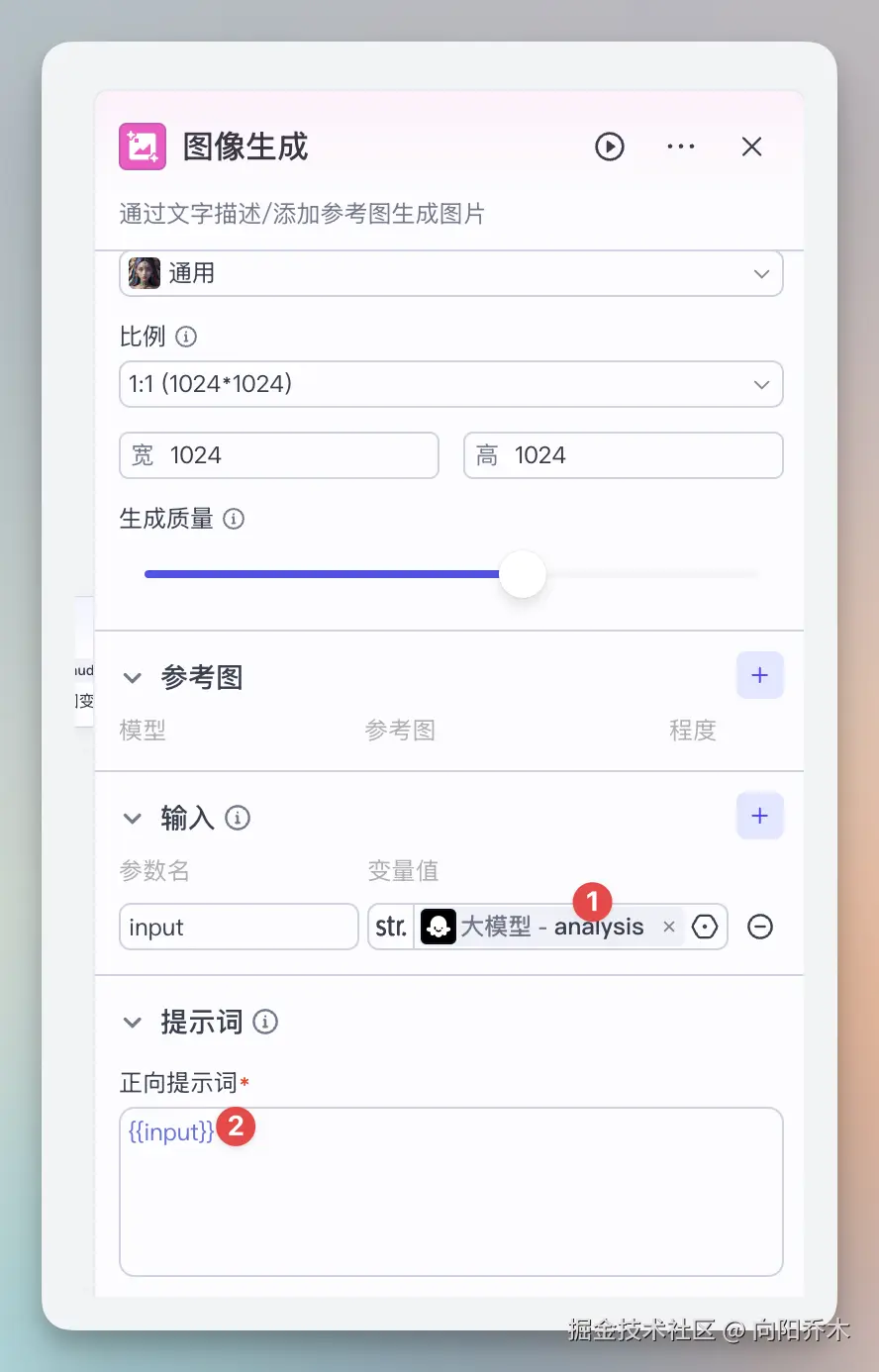 点“添加节点” ->"图像生成",连接大模型模块,input选大模型对应的一句话故事总结,提示词用{{input}} 变量。