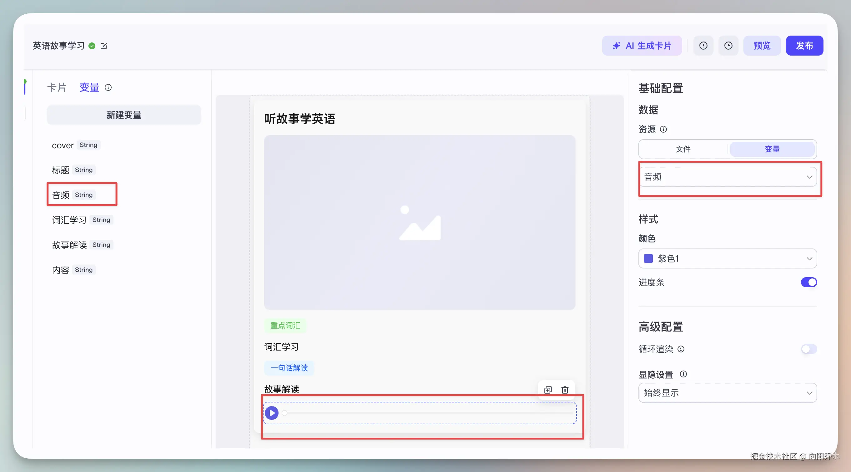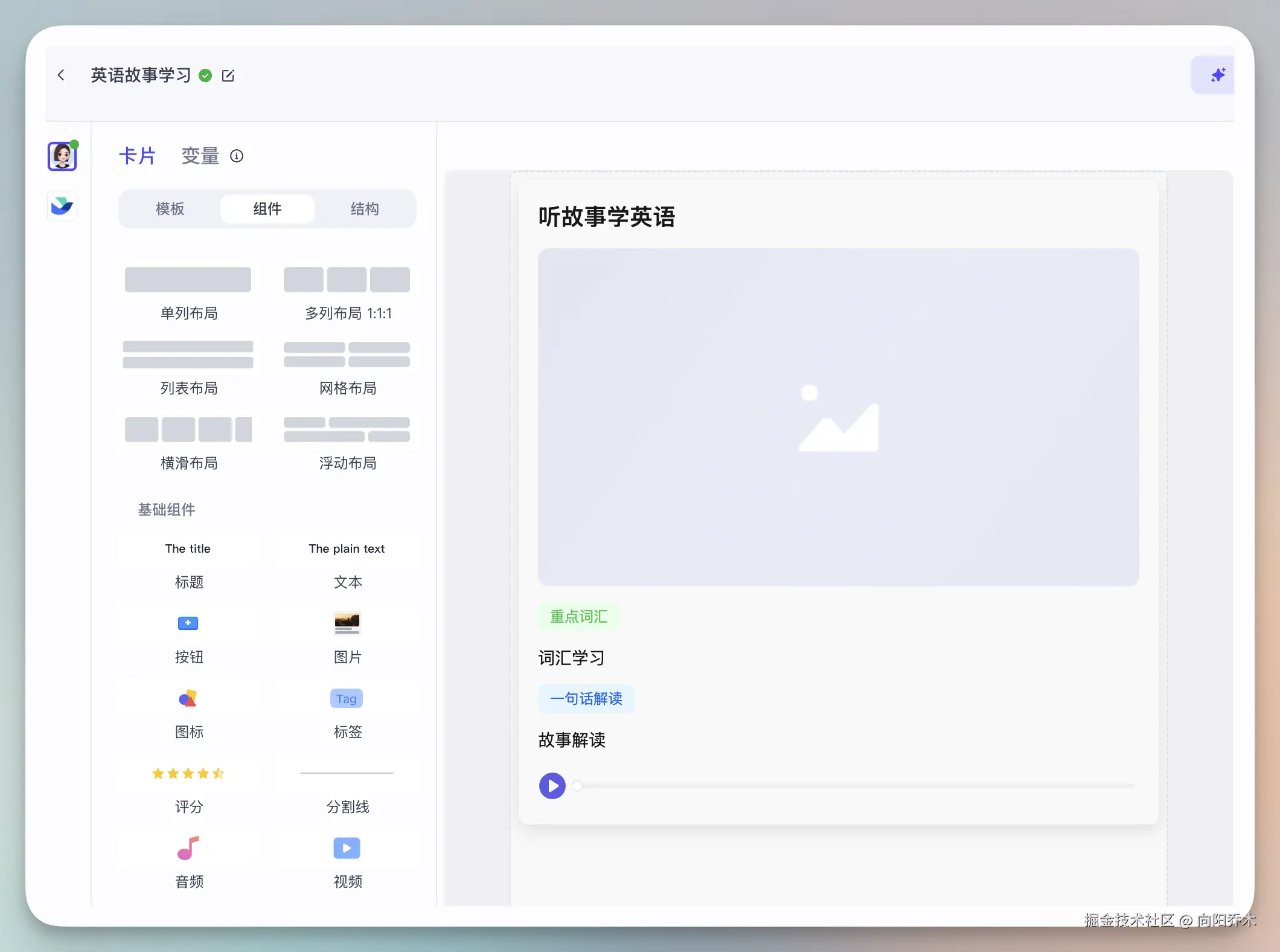 搭建英语故事学习卡片,用上了播放组件,文本组件,图片组件。