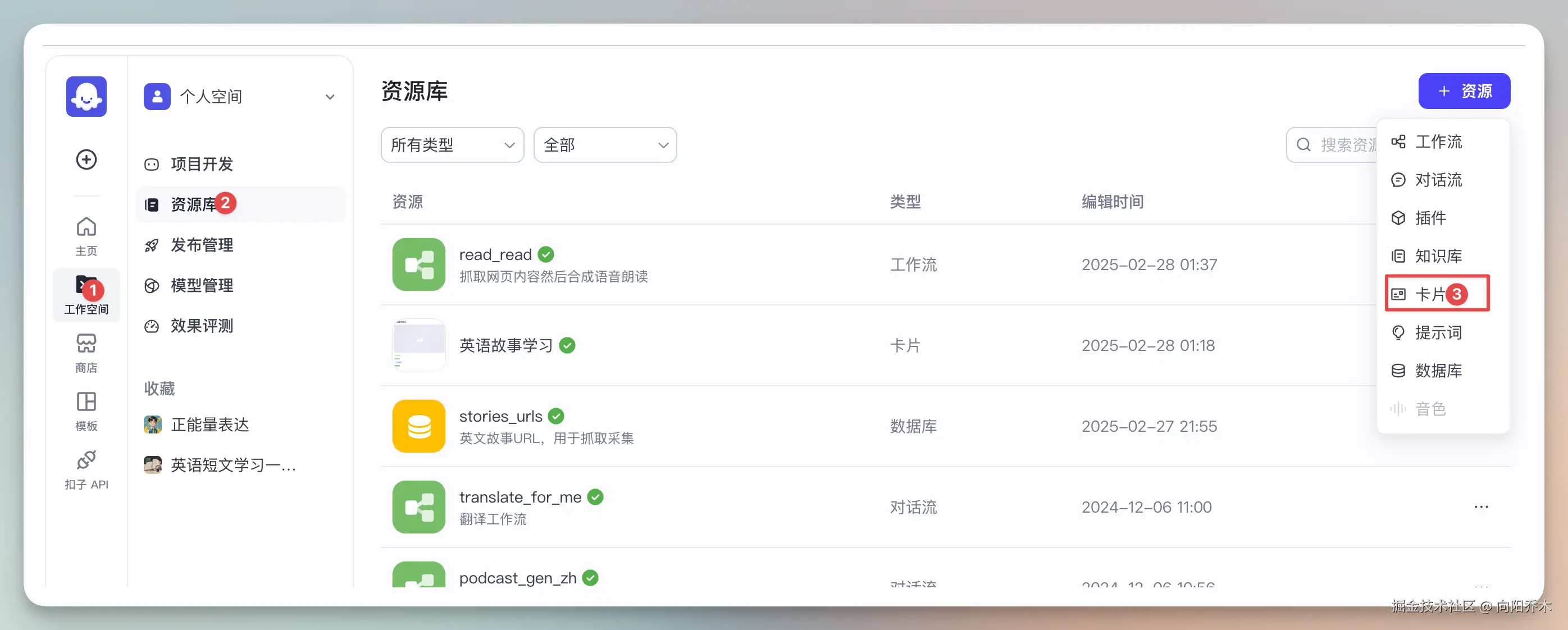 “首页”-"工作空间"-“资源库”-"卡片"