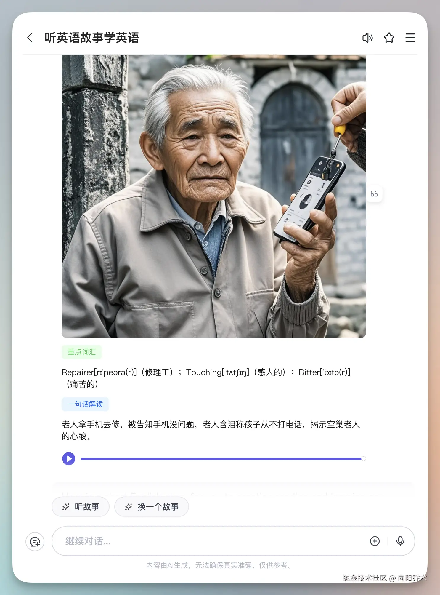 AI自动抓英文短篇故事,合成英文MP3文件,提取文章中CET4以上的词汇,总结一句话剧情,辅助理解和学习。
