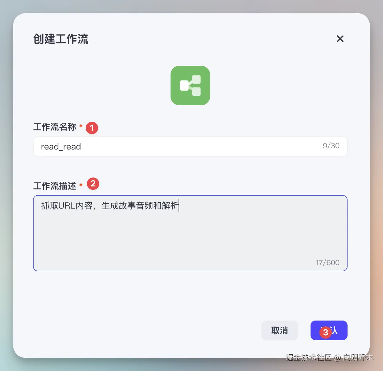 填写工作流名称(英文)和描述(方便AI理解调用,简单清楚)