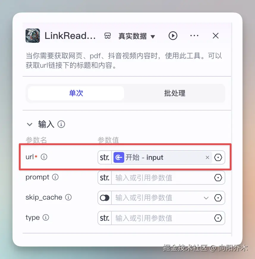 把第一步连到这个插件,点开配置,URL选第一步的input
