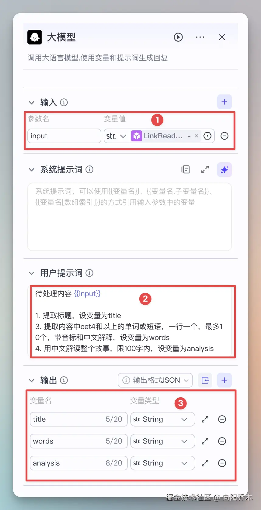 - 重点:用户提示词,一定要记得引用变量,就是{{input}},这是让LLM处理的内容。Prompt可以很简单,说明提取什么,设为什么变量。