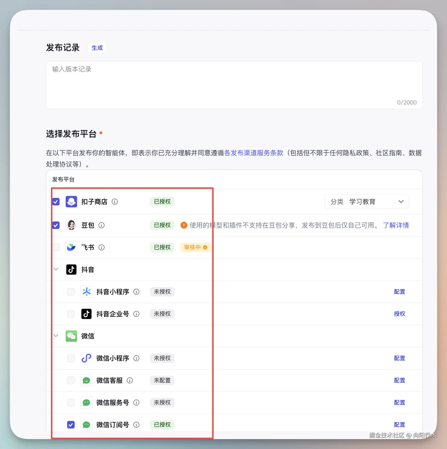 可以选很多发布渠道,比如豆包、飞书等等。