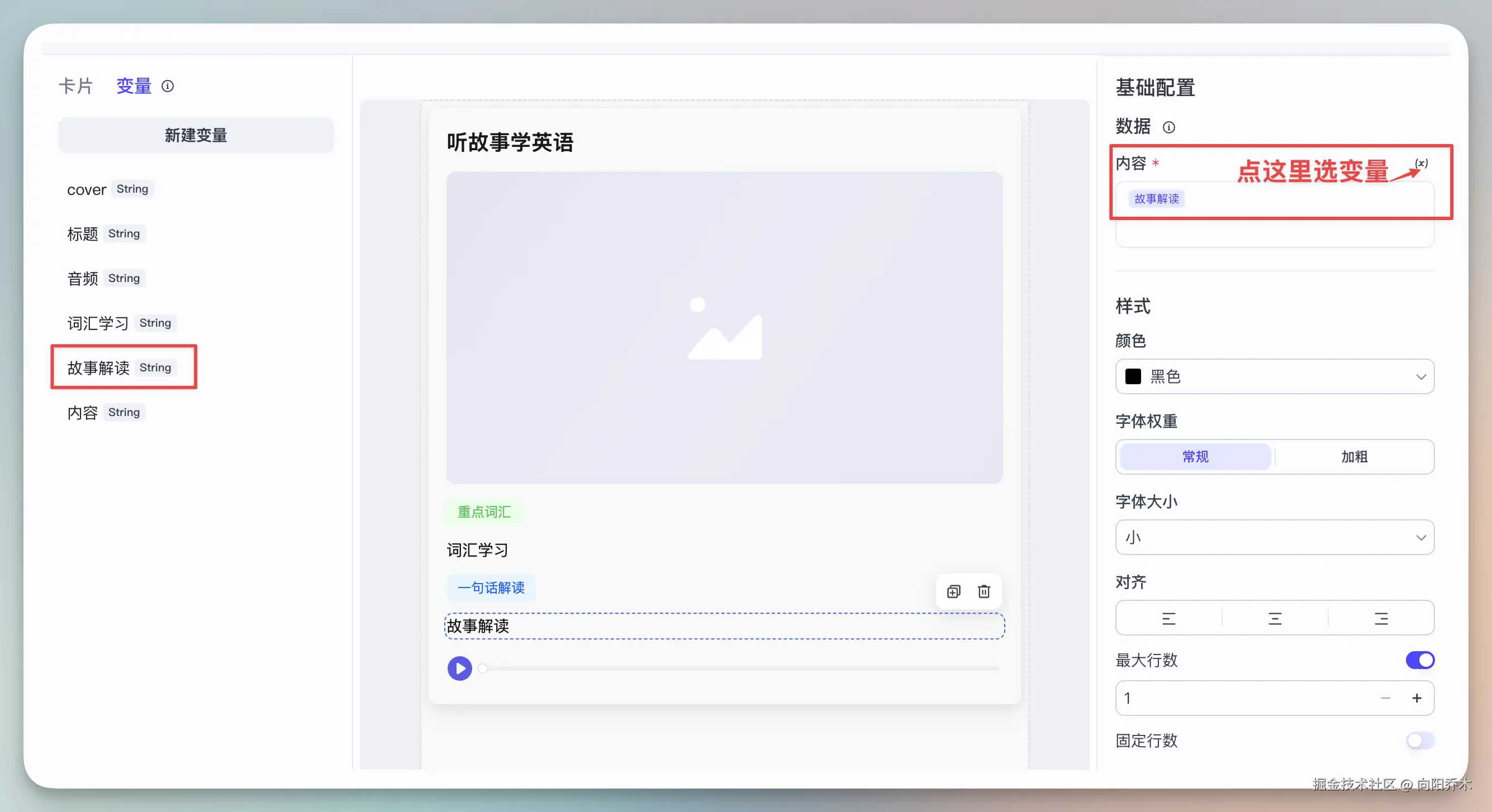 卡片设计完,一定要设定变量。 有了变量,才能把工作流输出的数据,显示在卡片上。