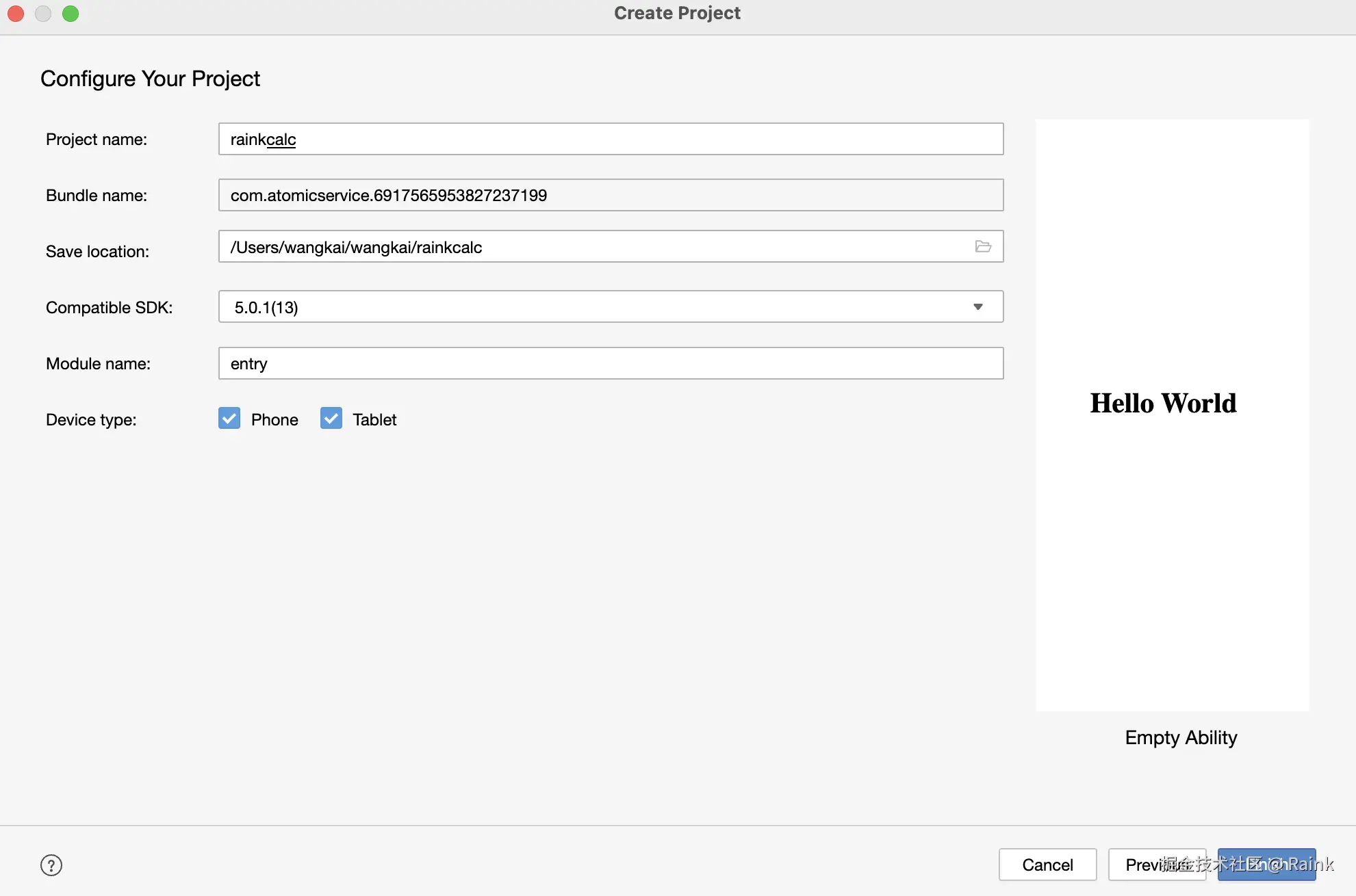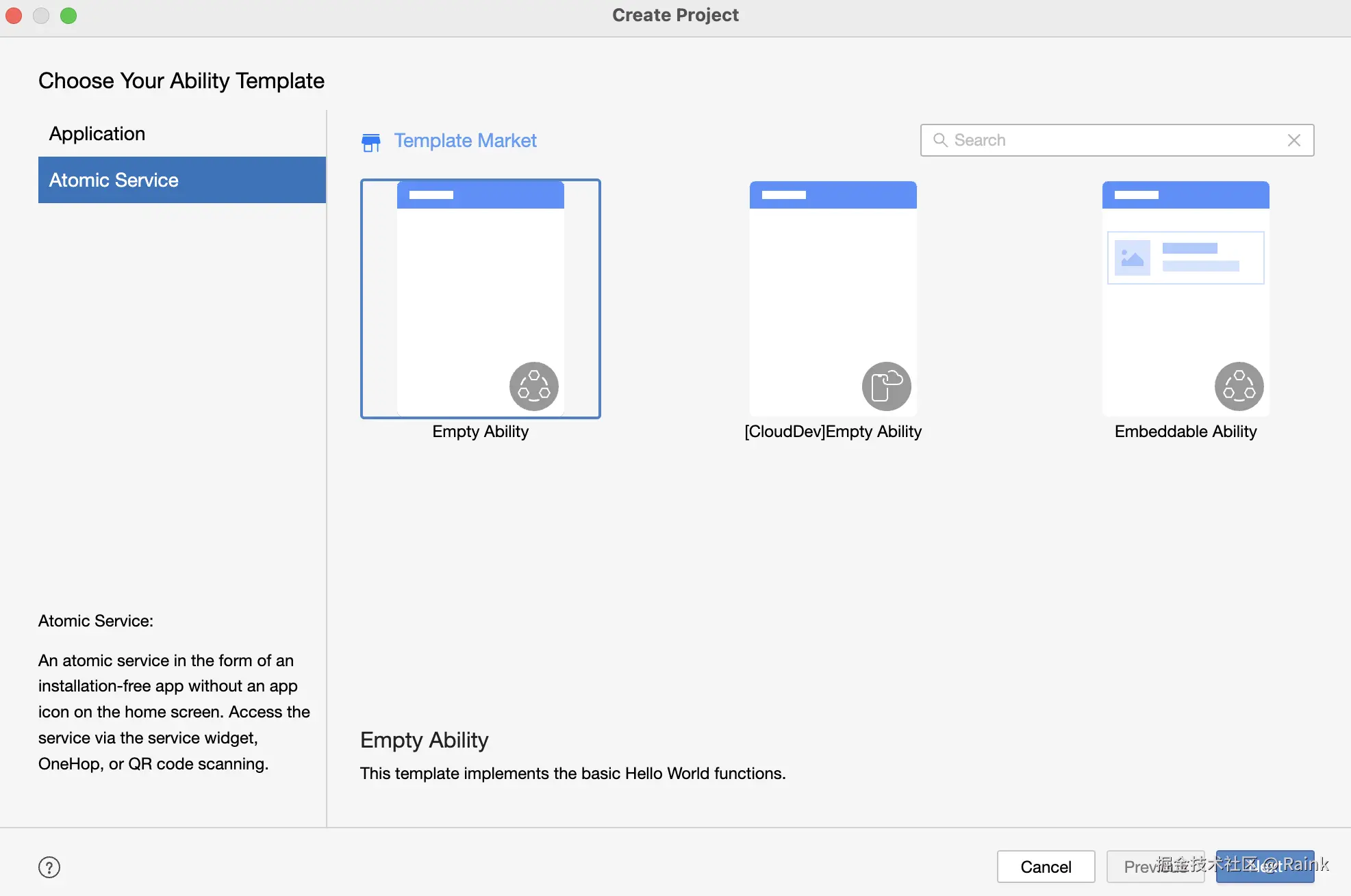 若首次打开DevEco Studio,请选择Create Project开始创建一个新工程。如果已经打开了一个工程,请在菜单栏选择File > New > Create Project来创建一个新工程。选择Atomic Service元服务开发,选择模板,单击Next进行下一步配置。