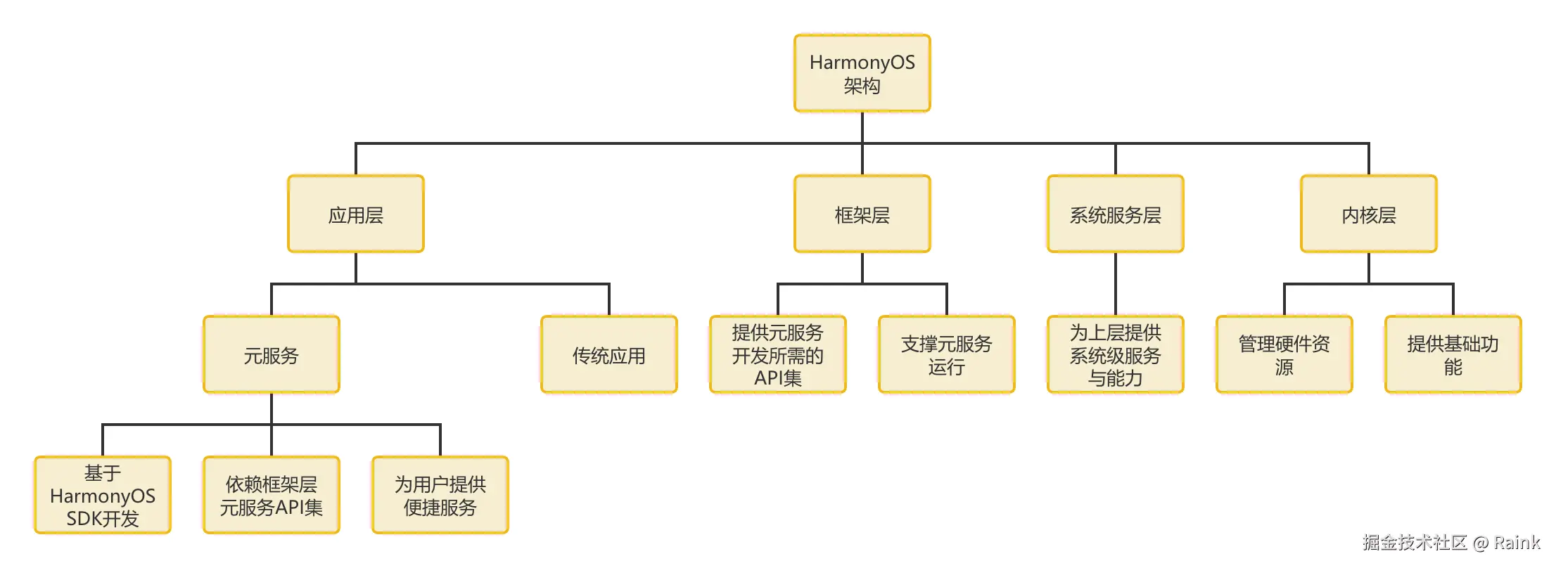 元服务基于HarmonyOS SDK开发,运行于 HarmonyOS的应用层。它依托系统的基础能力,如内核、驱动、框架等,为用户提供便捷的服务。在 HarmonyOS架构中,最底层是内核层,负责硬件资源管理等基础功能;往上是系统服务层,提供系统级的服务与能力;再往上是框架层,为应用开发提供各种 API 和开发框架,元服务依赖框架层中的 “元服务API集” 进行开发;最上层的应用层,包含了元服务和传统应用等各种应用程序。