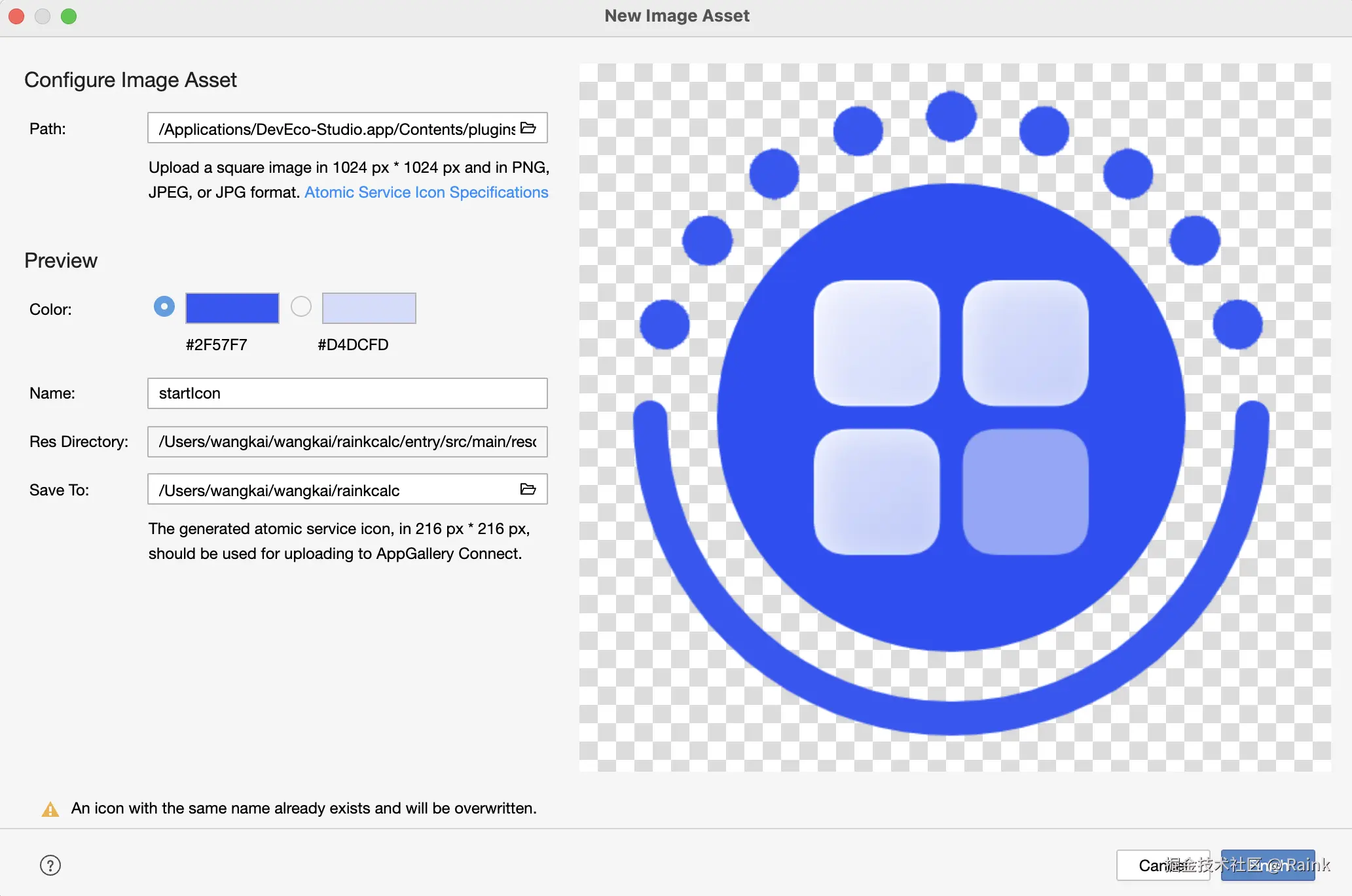 DevEco Studio的Image Asset功能可生成统一元服务图标样式。选中模块或文件右键操作进入配置页面,选择本地符合格式、尺寸等要求的图片,配置颜色、名称等,点击 OK 生成图标并可配置在module.json5 中。