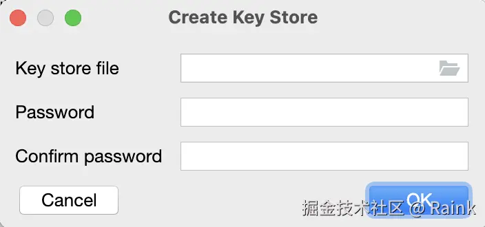 在Create Key Store窗口中,填写密钥库信息后,单击OK。