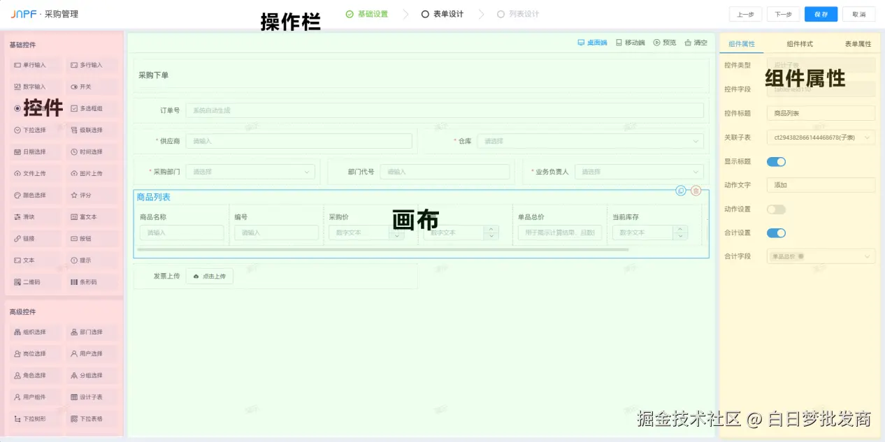 主要还是一些快捷键的入口,基础设置/表单设计/列表设计。还有pc/app的切换,JNPF的制品是两个端同时生产的,也就是你做好了pc,app自然也生成了。
