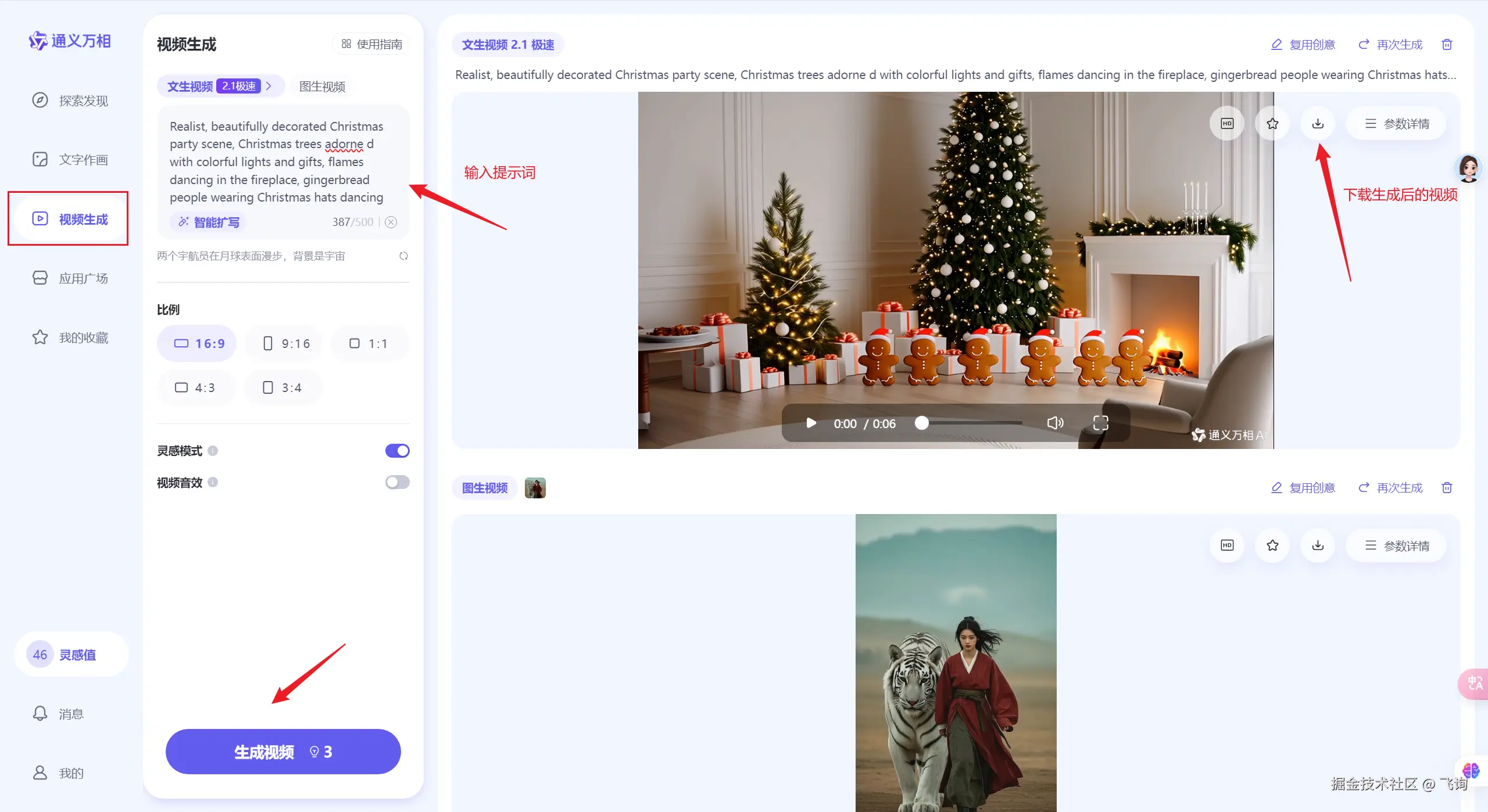 目前通义万相是按照灵感值绘画以及生视频的,每天签到就能领50灵感值,一天能免费生成16个视频左右