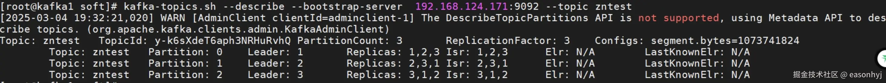 # kafka-topics.sh --describe --bootstrap-server 192.168.124.171:9092 --topic zntest