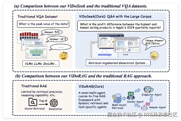 该系统在 GPT-4o 上的准确率达到 79.4%,这一数据不仅突显了其卓越的性能,还与传统的 RAG 系统形成了鲜明对比。虽然传统 RAG 系统在文本生成任务中表现良好,但在处理视觉文档时,往往受到单一模态检索能力的限制,准确率通常较低。而 ViDoRAG 通过引入视觉信息与文本信息的深度融合,成功地将准确率提升了超过 10 个百分点。 (@AI TOP100)