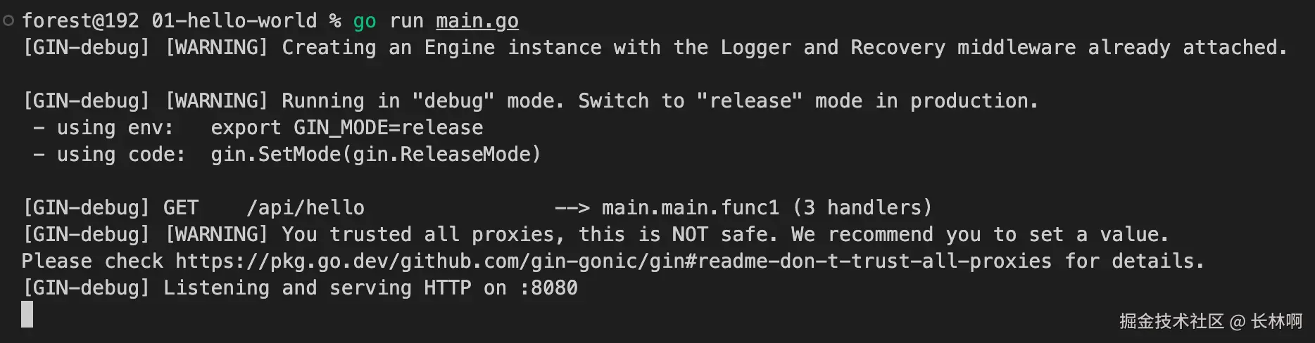 在终端中执行 go run main.go 命令启动服务器,终端效果如下图: