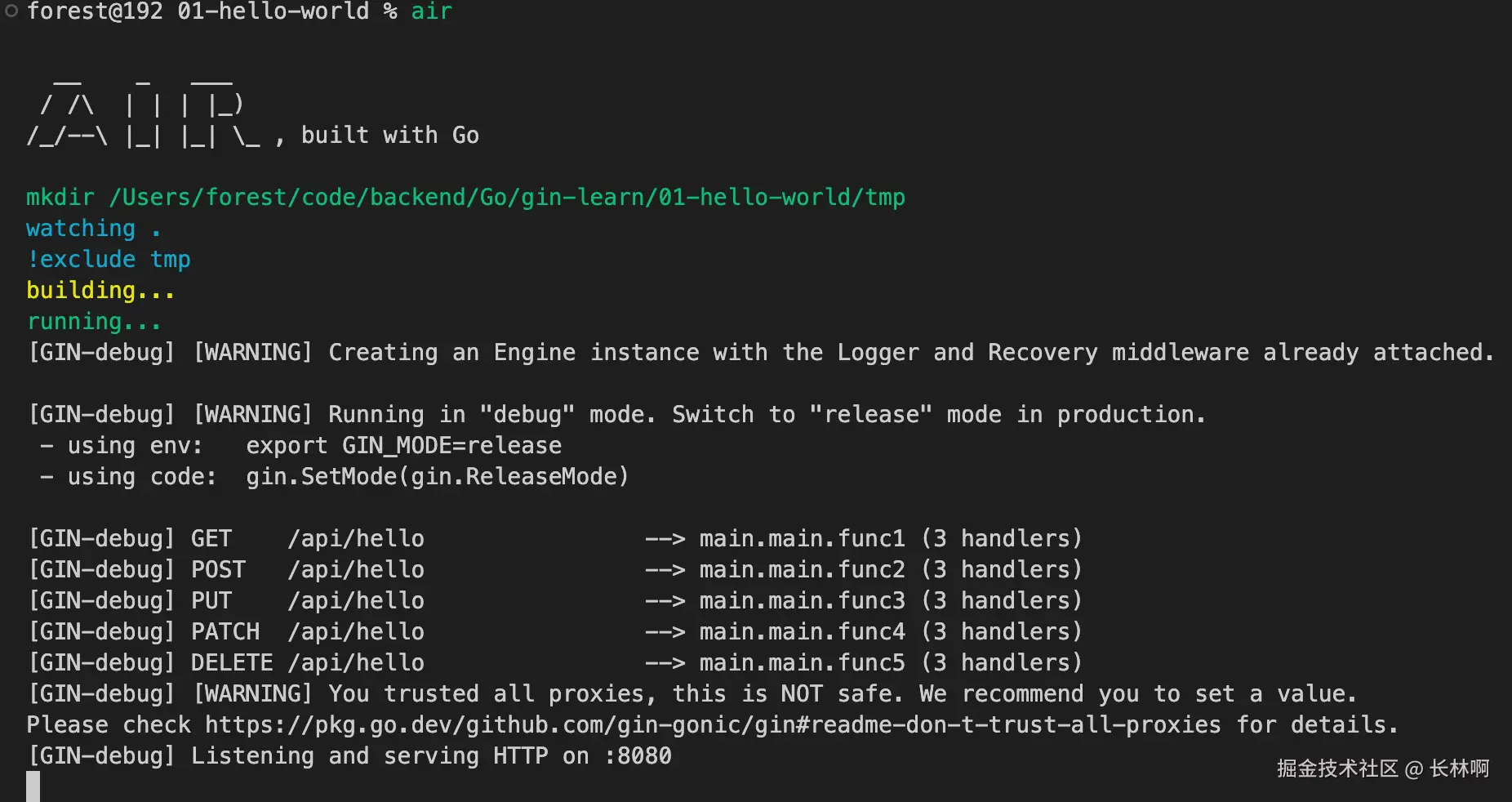 在项目根目录下运行 air,它会自动监视代码变动并重启服务: