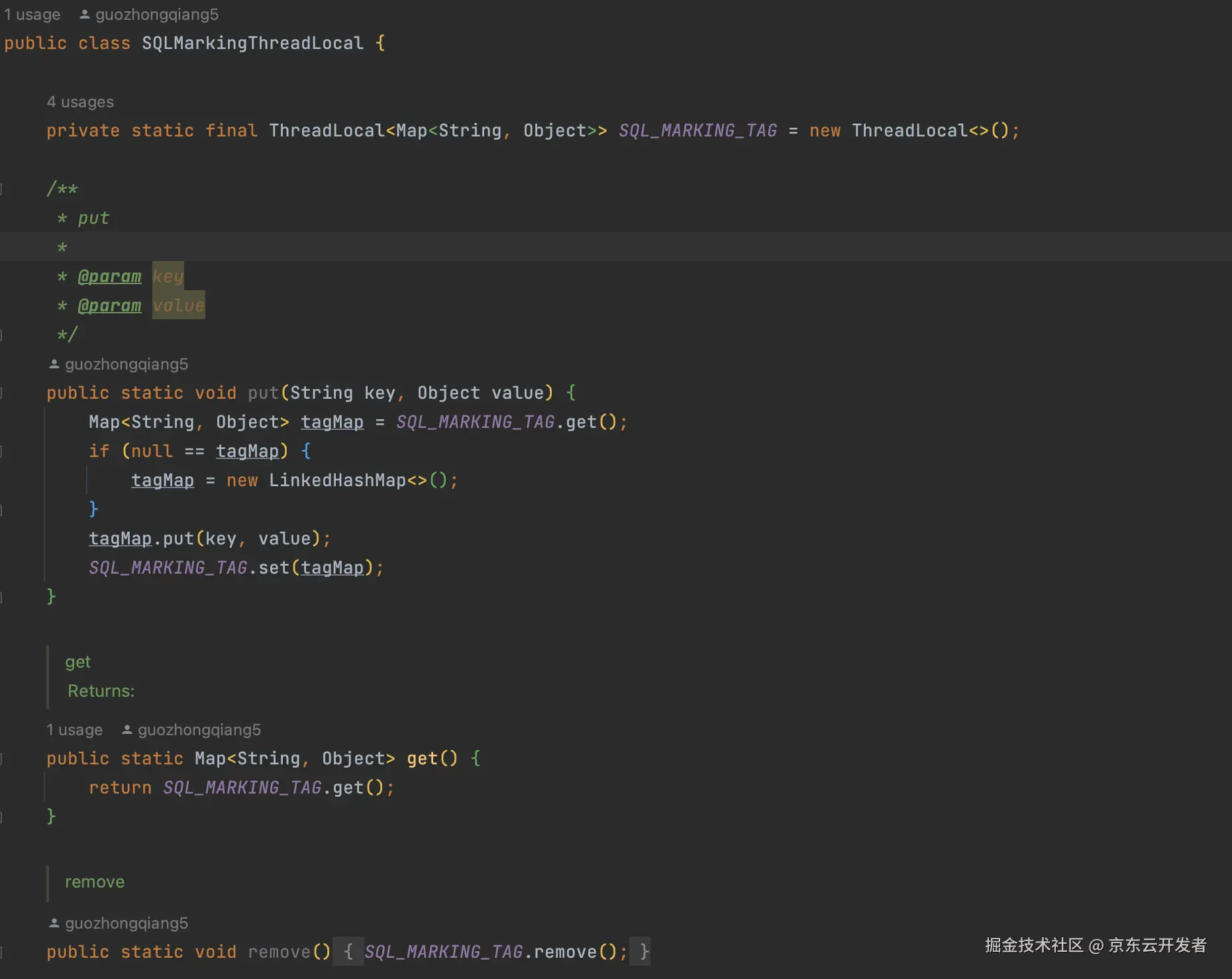 SQL 执行完 remove 掉。一个方法同时执行多个SQL时,如果 SQLMarkingThreadLocal 可共享,也可以在方法维度上 put 和 remove,就不用每个SQL put remove一下。主要是看线程上下文是否应该传递SQLMarkingThreadLocal的信息。