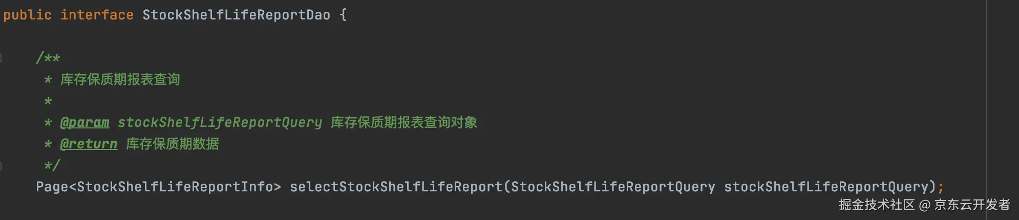 通过这个染色标记后的SQL我们可以一眼看出来,这个SQL是来自StockShelfLifeReportDao中的selectStockShelfLifeReport方法,其中StockShelfLifeReportDao对应于mapper文件中的namespace,selectStockShelfLifeReport 对应于 SQL id。