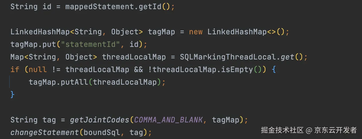 插件除了会自动拼接statementId和pFinderId外,还预留了一个ThreadLocal变量,允许使用者执行线程的上线文中向SQL传递附加信息,比如SQL的执行用户ERP、执行线程的id等。
