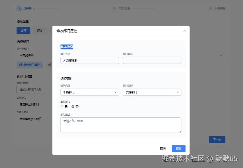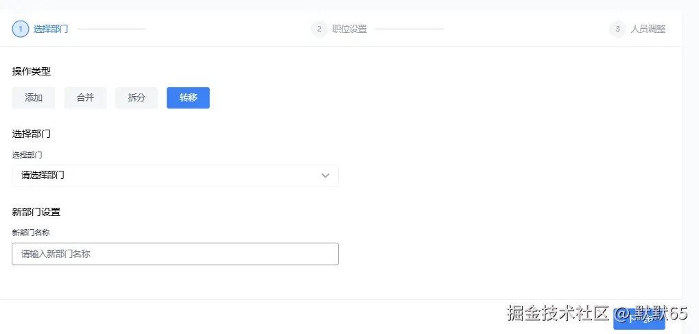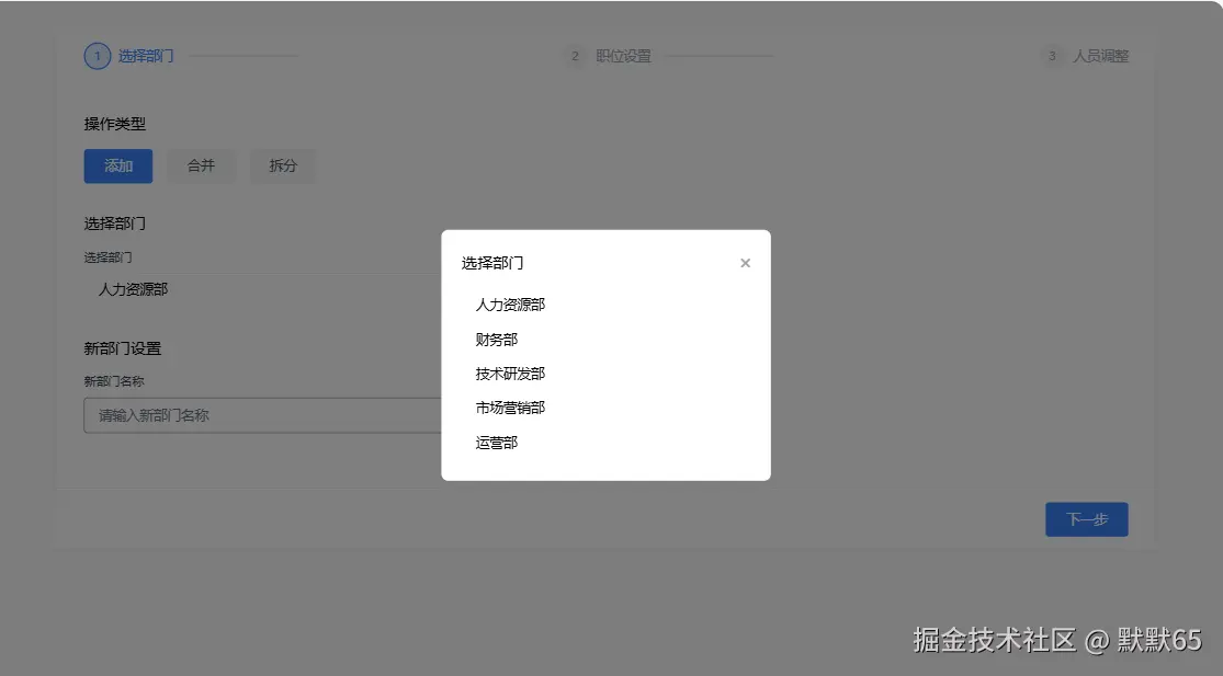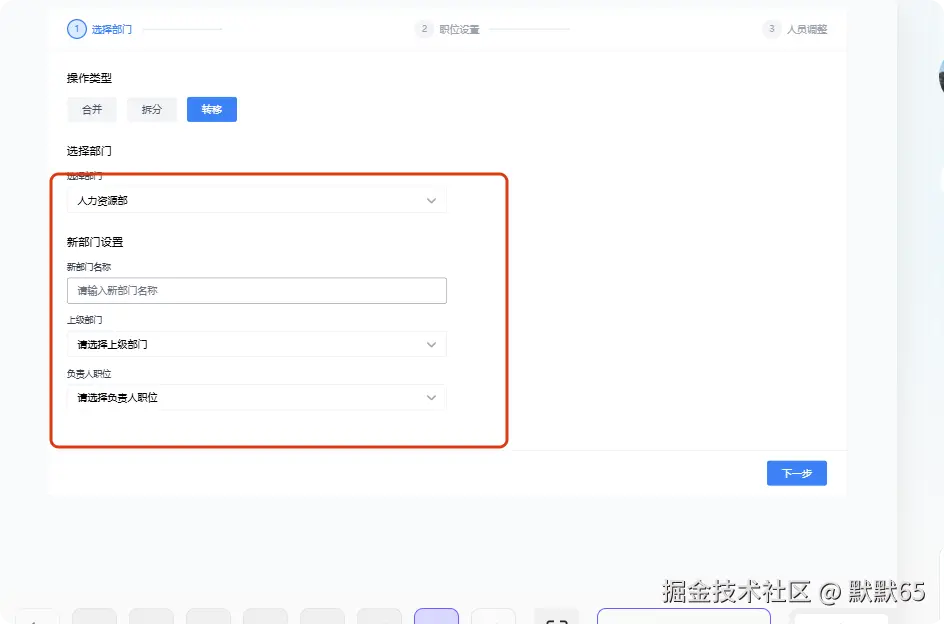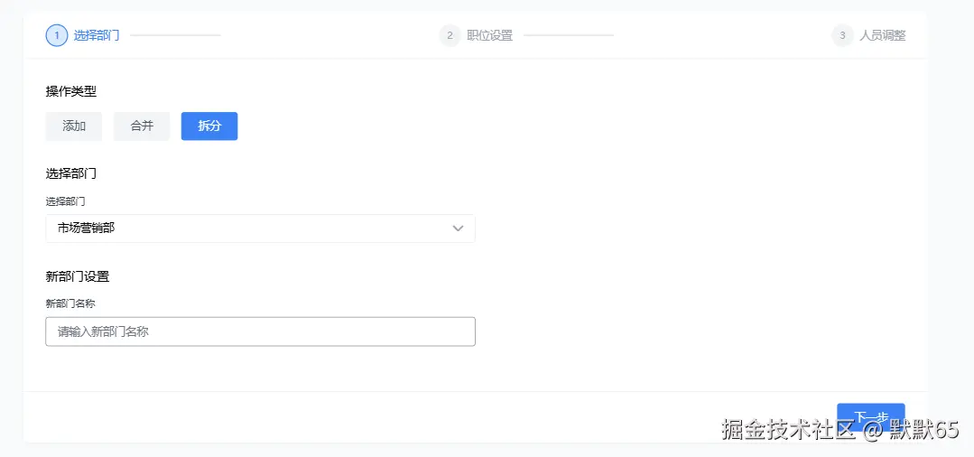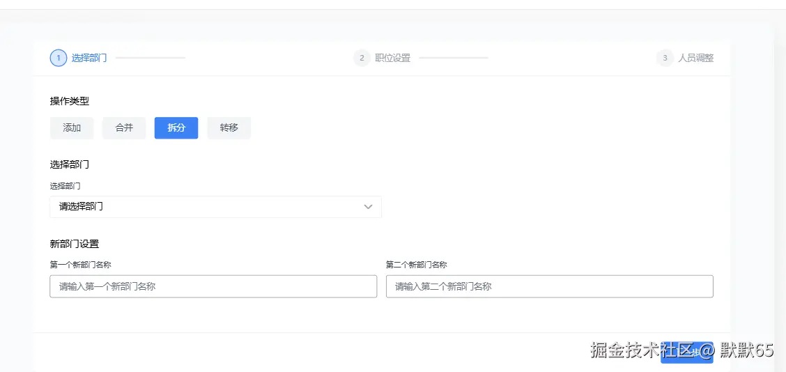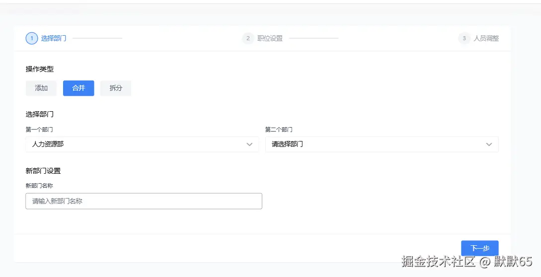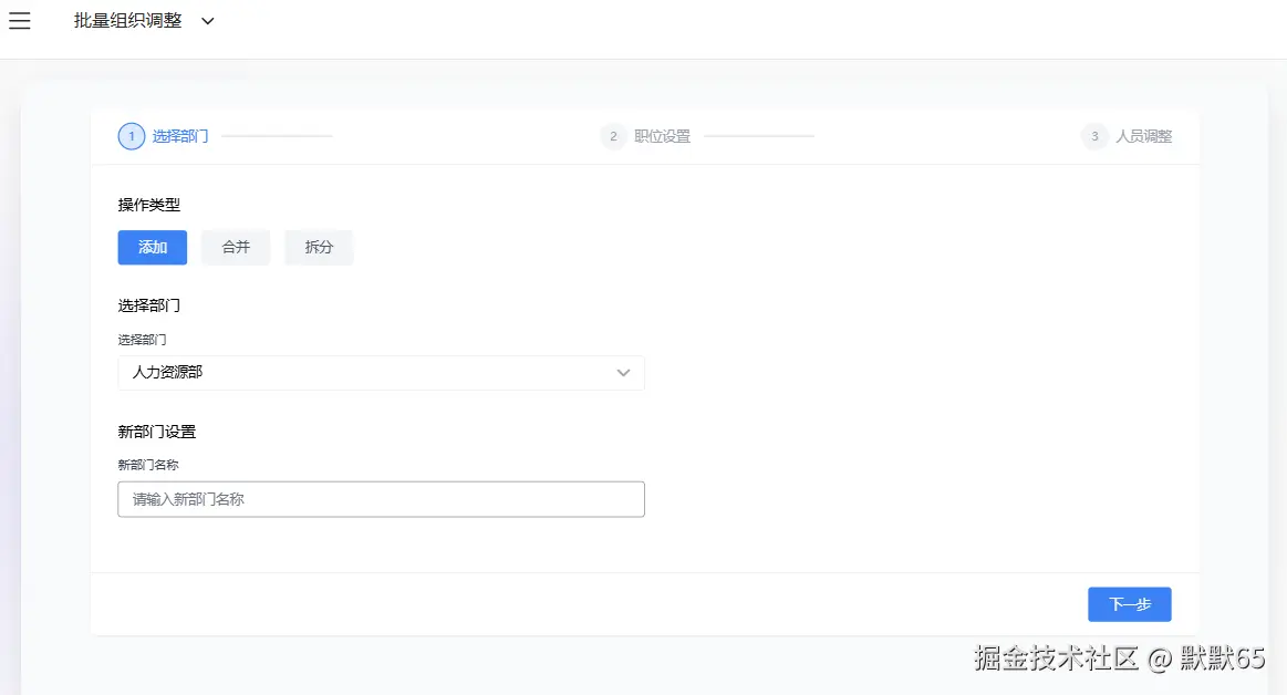 生成一个批量调整部门的功能,用于部门管理模块中,为管理员提供便捷的批量操作。批量调整部门功能应包括选择目标部门、添加或合并,拆分、设置新部门名称和批量保存操作选项。批量调整部门功能需要直观的交互界面,管理员能轻松操作。提供清晰反馈确保操作成功。批量调整部门功能界面可包括以下模块:第一步是 目标部门选择、部门职位管理、新部门设置和保存选项等。以确保管理的便捷与高效。第二步是 职位选择、新职位设置,复制原职位属性,设置新职位属性选项等。第二步是 人员选择、包含人员的现有信息(原职位编号,原职位名称,员工状态,员工类别等),人员新职位选项等。