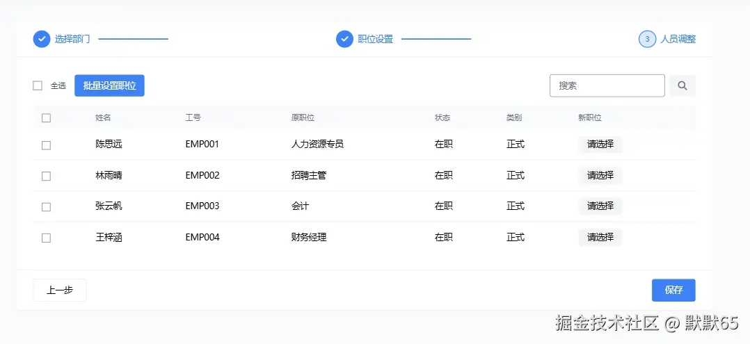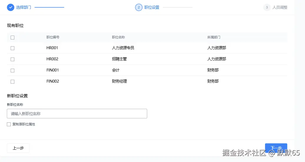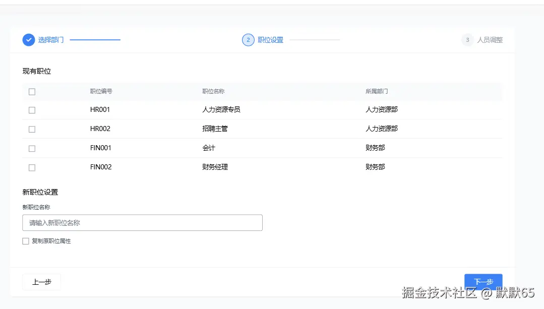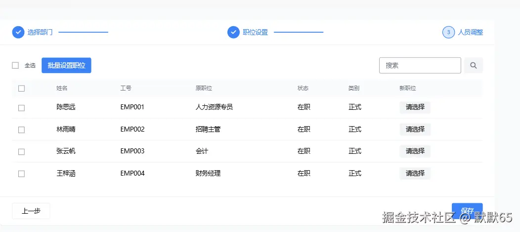 显示选择部门 > 职位设置 > 人员调整三个主要步骤,当前步骤高亮显示,已完成步骤显示对勾,未进行步骤置灰。