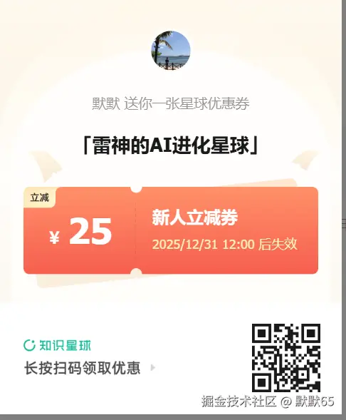 然后给大家设置了5折的优惠券。相当于花25元就可以加入雷神的知识星球了。以后可以有一年的时间