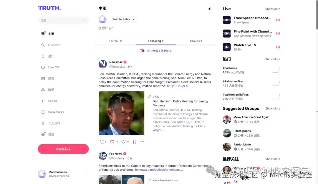 Truth Social,由川普于2021年创立,自上线以来便迅速成为国际新闻焦点。该平台以其与X相似的页面风格和懂王自带的鲜明嘴炮色彩吸引了数千万用户注册使用,并一度登上App Store社交媒体类榜首。在Truth Social上,用户不仅可以自由发表言论,还能关注自己感兴趣的话题和人物,如懂王这种大V吃瓜看戏。