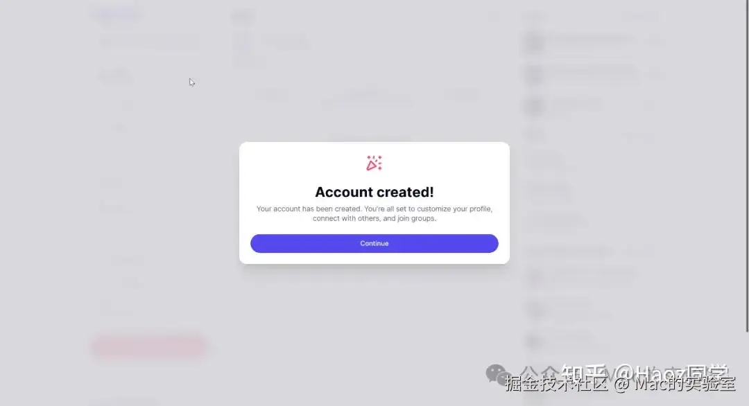 完成上述步骤后,您会看到“Account created!”的提示信息。此时,您可以点击“Continue”继续完善自己的头像、签名、简介等信息,也可以选择跳过这一步直接进入首页。