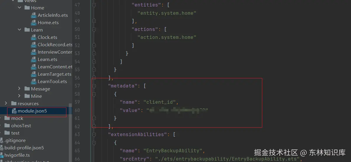 在工程中entry模块的module.json5文件中,新增metadata,配置name为client_id,value为上一步获取的Client ID的值